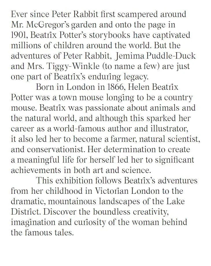 Telling the complete life story of Beatrix Potter, this exhibition invited visitors of all ages to discover this world-renowned author and illustrator’s unbridled creatvity and passion for nature, following her journey from storyteller to natural scientist and conservationist. The exhibition included family activities and labels aimed at young readers, and was a collaboration with the National Trust.