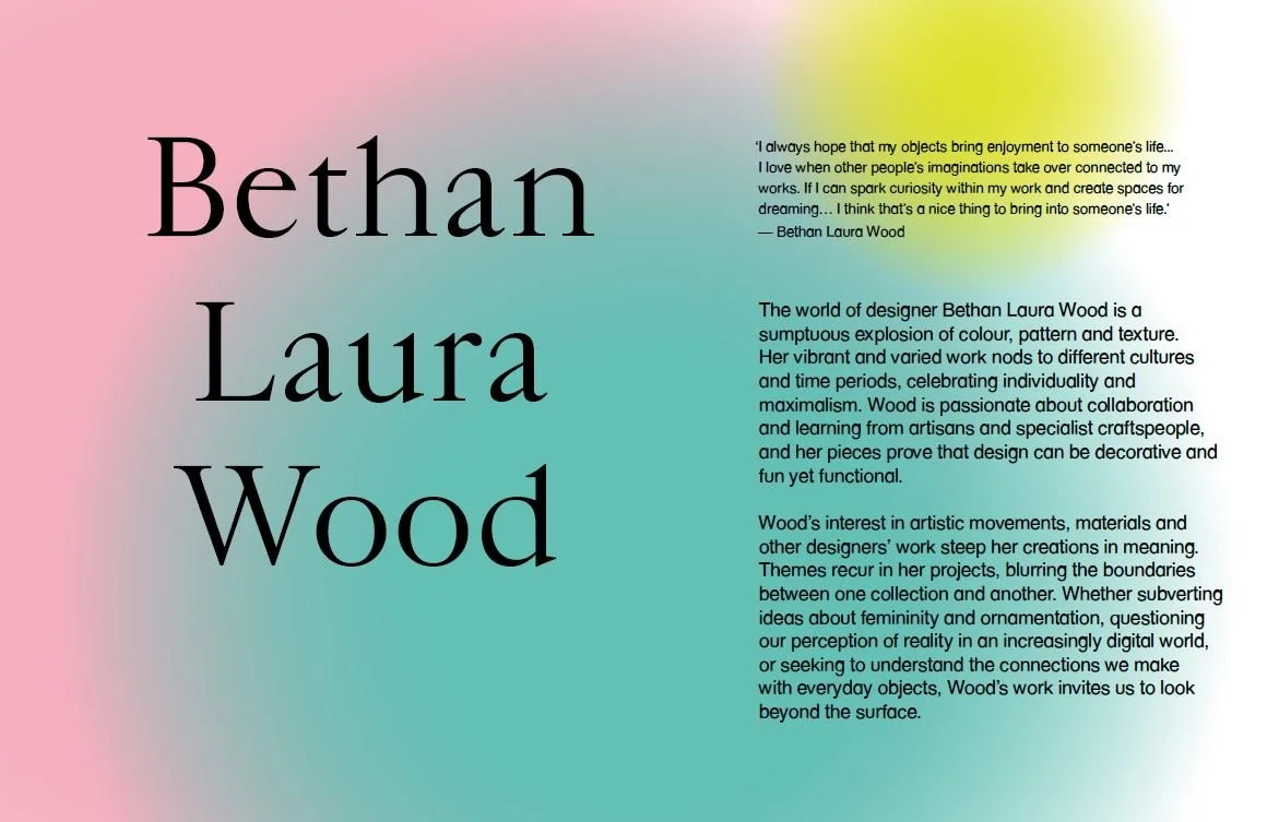 I edited all of the interpretative panels and labels for this display. Delving into the kaleidoscopic creative world of British designer Bethan Laura Wood, it explores the process behind her finished pieces.