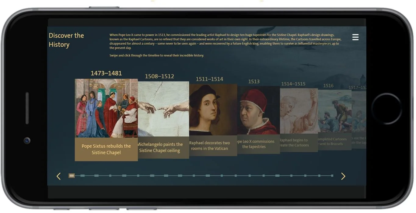 This permanent gallery at the V&A houses the Raphael Cartoons, seven full-scale designs that Raphael created for a series of tapestries for the Sistine Chapel. The major refurbishment of the gallery included a new interpretive approach to offer visitors a more in-depth engagement with the artworks, through digital gallery interpretation and three gallery books.